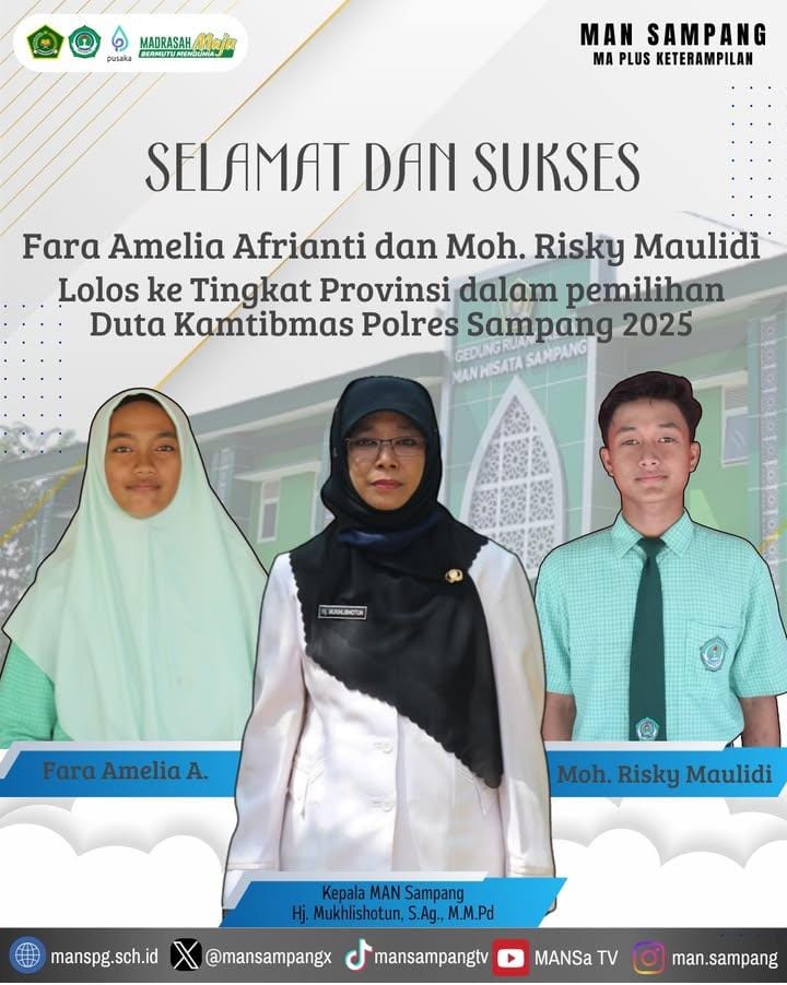 kemenagsampang.com-Prestasi membanggakan kembali diraih siswa Madrasah Aliyah Negeri (MAN) Sampang. Dua putra-putri terbaik, Fara Amelia Afrianti dan Moh. Rizky Maulidi, berhasil melaju ke tingkat provinsi dalam ajang Pemilihan Duta Keamanan dan Ketertiban Masyarakat (Kamtibmas) 2025 yang digelar Polres Sampang.