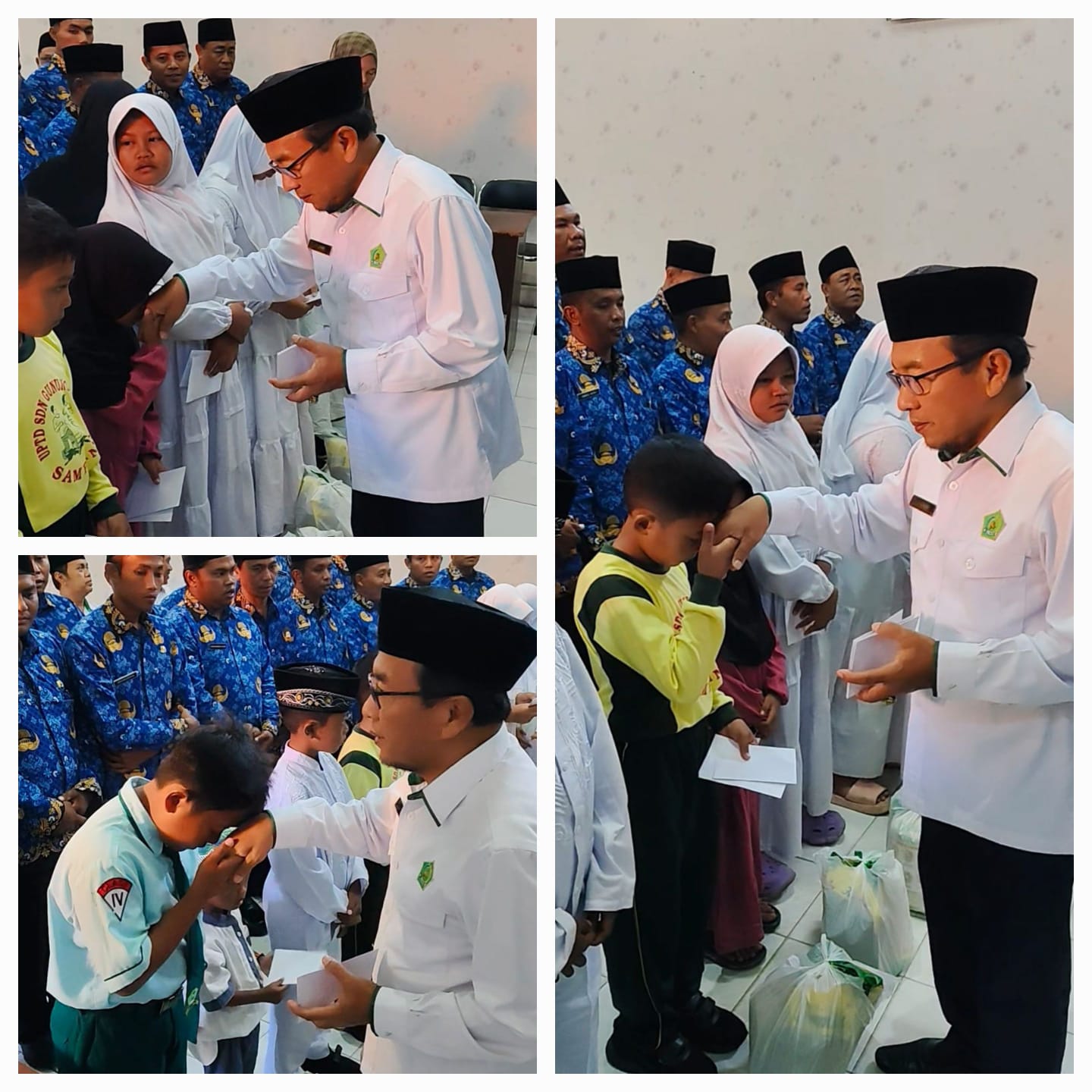 kemenagsampang.com-Suasana haru menyelimuti Aula Kantor Kementerian Agama (Kemenag) Kabupaten Sampang saat puluhan anak yatim piatu menerima santunan dari Kepala Kemenag Sampang, Fandi, Selasa (7/10/2025).