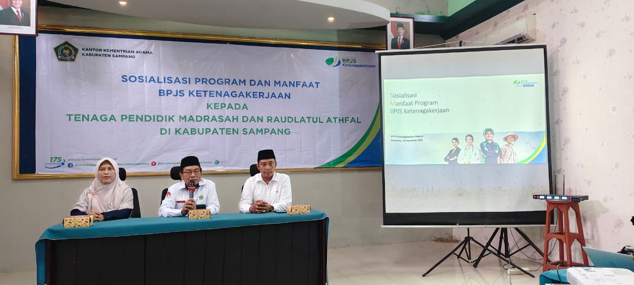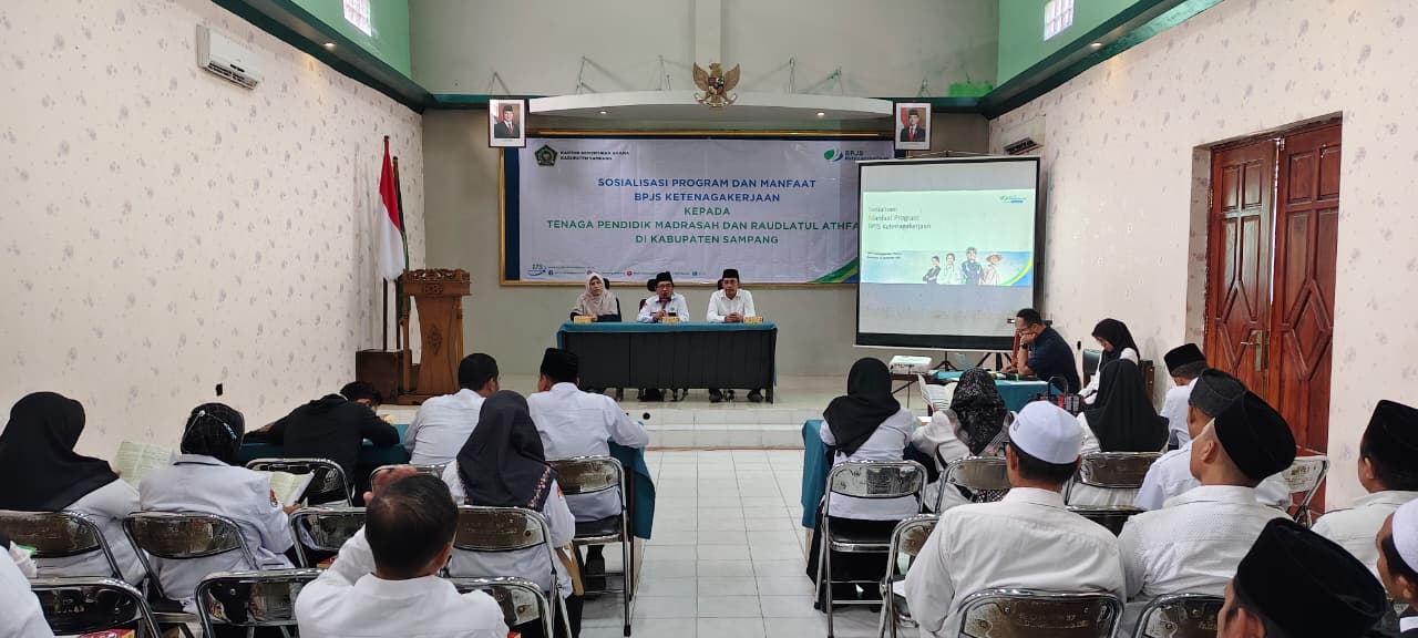 kemenagsampang.com-Kantor Kementerian Agama (Kemenag) Kabupaten Sampang menggelar sosialisasi Program BPJS Ketenagakerjaan bagi tenaga pendidik dan kependidikan di lingkungan Raudlatul Athfal (RA) dan madrasah se-Kabupaten Sampang. Acara berlangsung di Aula Kemenag Sampang, Selasa (30/9/2025), sejak pukul 08.00 WIB.