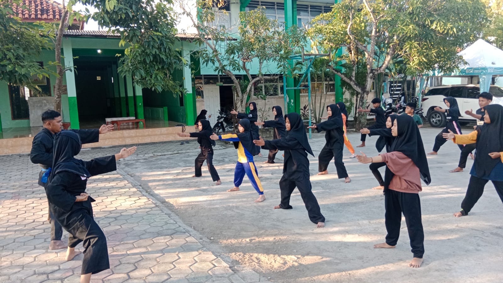 Latihan perdana yang digelar di halaman madrasah ini dipandu oleh empat pelatih: Kak Soim, Kak Garnis, Kak Istifaroh, dan Kak Adelia. Mereka membimbing para peserta dengan penuh semangat dalam materi dasar pencak silat, seperti posisi kuda-kuda, pukulan, dan tendangan dasar yang benar—fondasi utama dalam seni bela diri tradisional Indonesia.