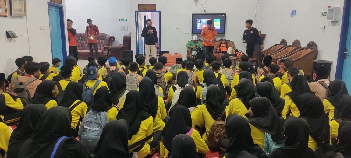 Moh. Hozin membuka sesi dengan pemaparan tentang gempa bumi dan langkah penyelamatan diri saat bencana terjadi. Ia mengajarkan teknik dasar seperti berlindung di bawah meja, melindungi kepala, hingga bergerak menuju titik kumpul yang aman.
