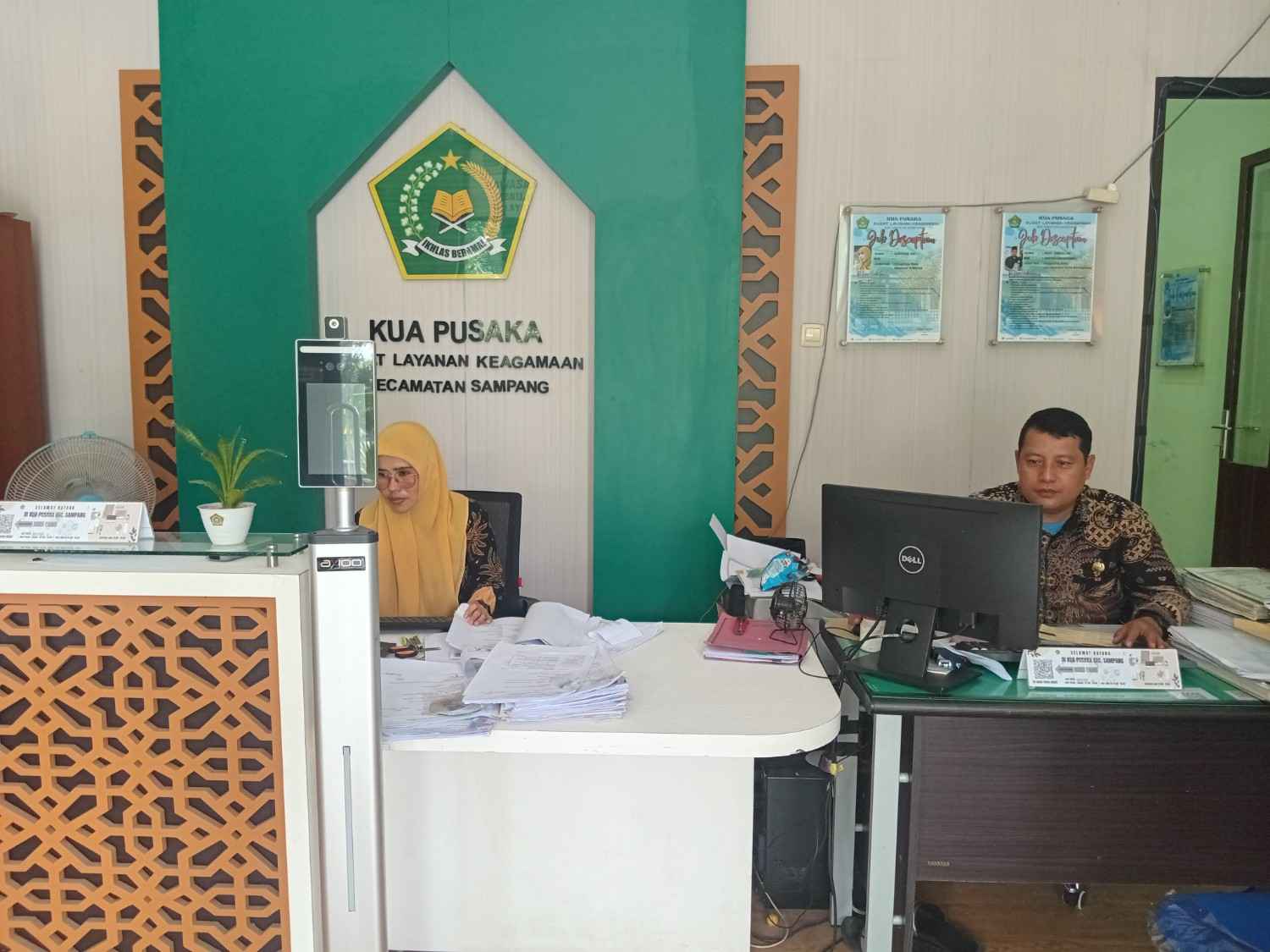 Front office KUA Kecamatan Sampang menjadi garda terdepan dalam memberikan informasi, menerima berkas, serta membantu masyarakat dalam setiap proses administrasi, baik terkait pernikahan, perwakafan, bimbingan keluarga sakinah, maupun layanan keagamaan lainnya. Dengan sikap ramah, tanggap, dan profesional, petugas front office mampu menciptakan suasana pelayanan yang tertib dan nyaman.