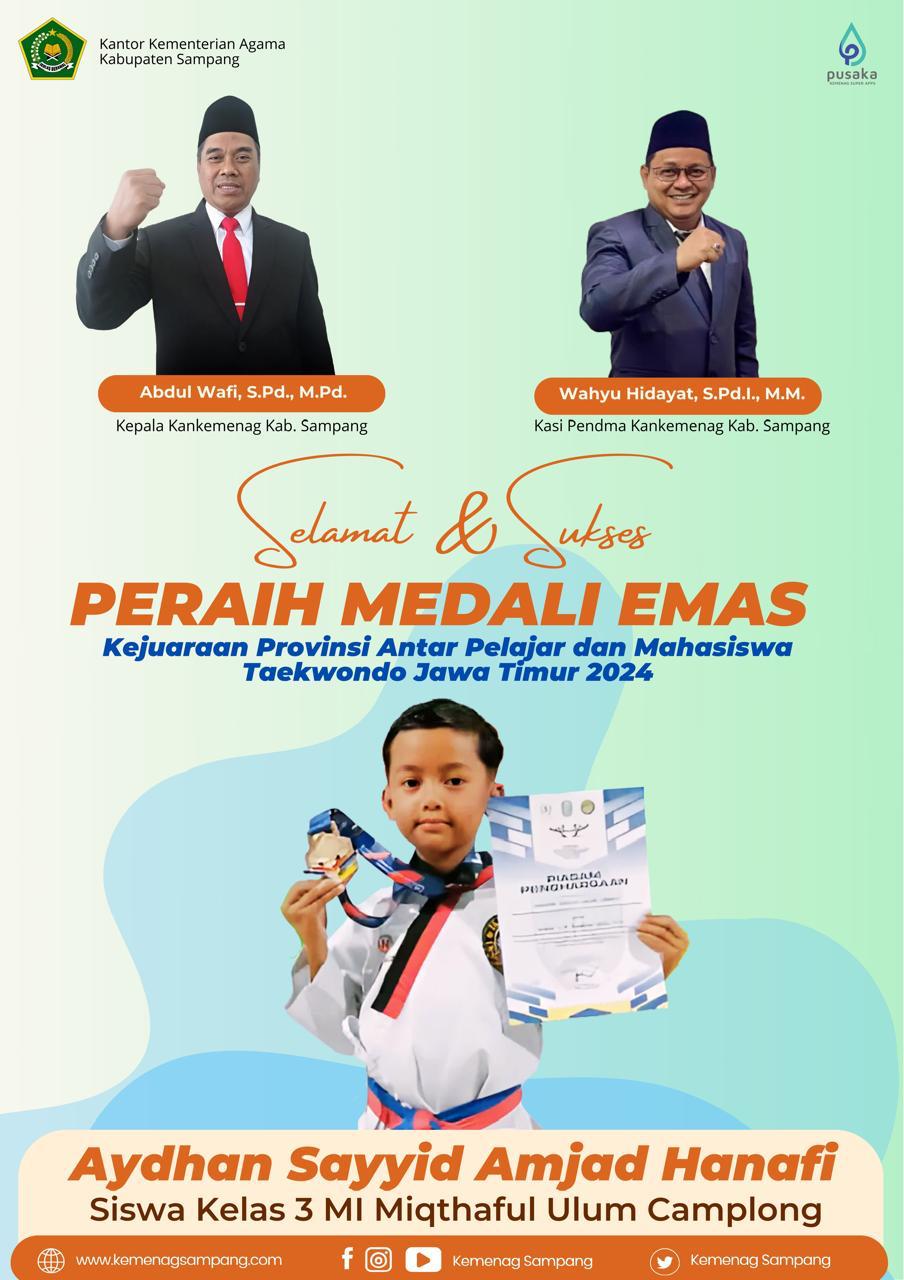 Seorang siswa kelas 3 Madrasah Ibtidaiyah (MI) Miqthoful Ulum, Aydhan Sayyid Amjad Hanafi, berhasil meraih medali emas dalam ajang Taekwondo antar pelajar dan mahasiswa tingkat Provinsi Jawa Timur.
