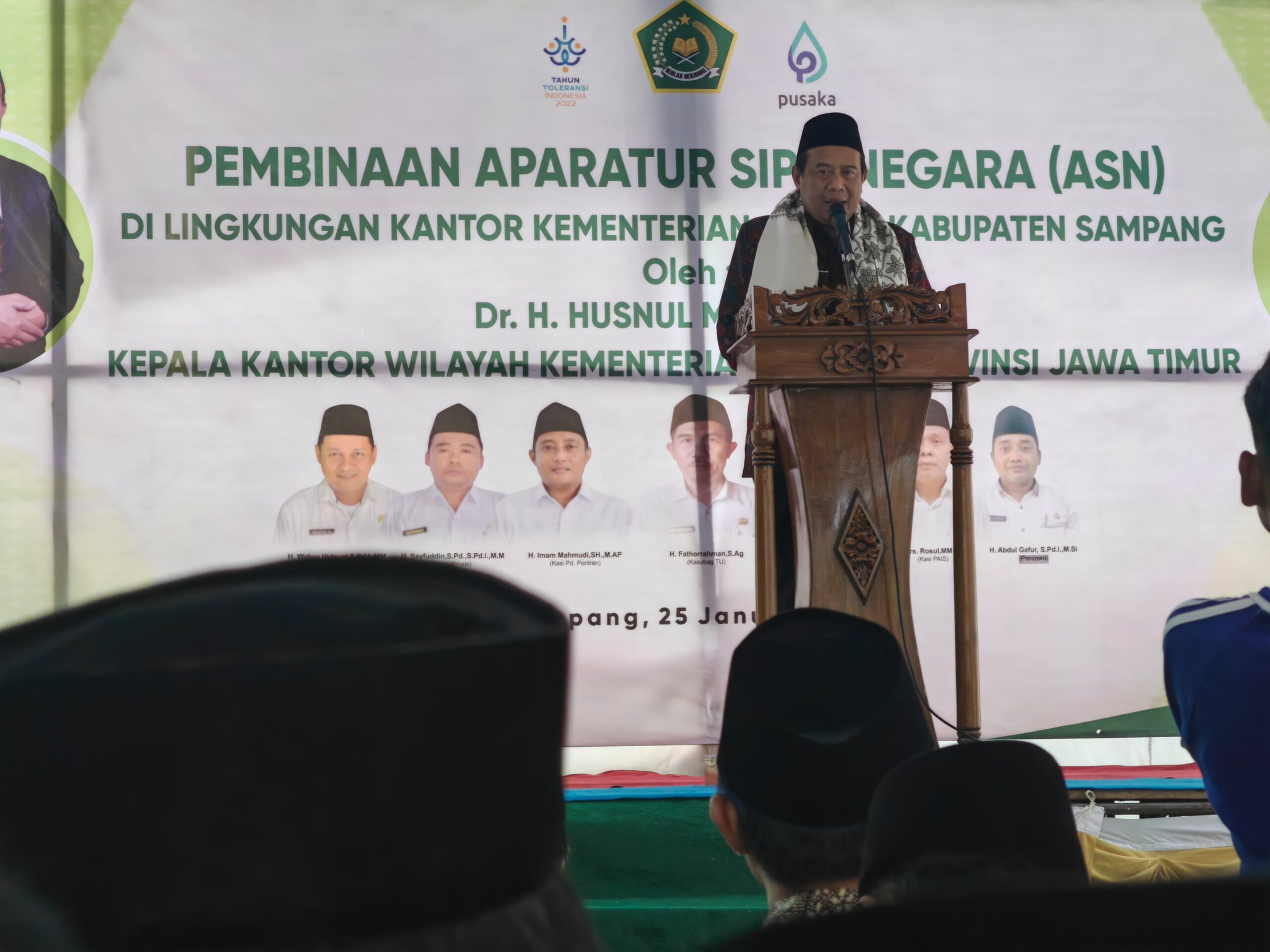 Turut Hadir seluruh pejabat di lingkungan Kankemenag Kabupaten Sampang, para kepala KUA Kecamatan, para pengawas madrasah, penghulu, penyuluh dan tenaga fungsional lainnya.